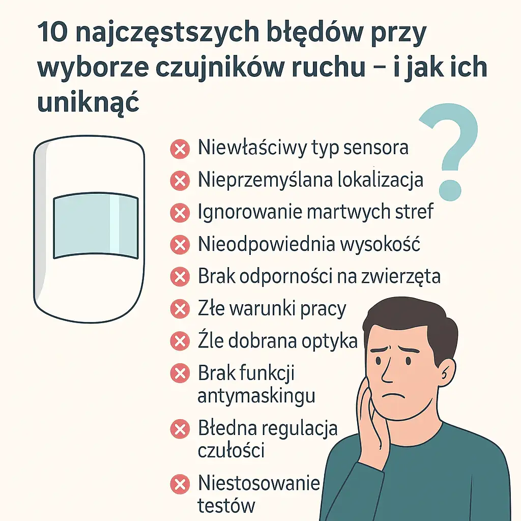 Wybór czujników ruchu to więcej niż tylko decyzja o marce czy cenie. W tym poradniku poznasz 10 najczęstszych błędów, które mogą obniżyć skuteczność Twojego systemu alarmowego. Sprawdź, jak uniknąć fałszywych alarmów, martwych stref i problemów z kompatybilnością, aby Twój dom lub firma były bezpieczne przez całą dobę.