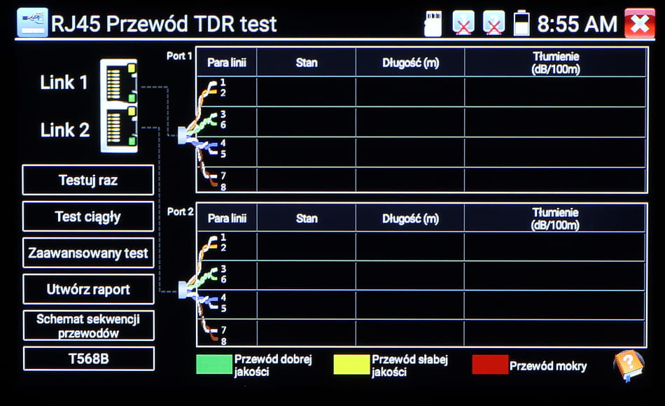 | Reflektometr TDR: | Wykrywanie i lokalizacja miejsca przerwania kabla (tylko UTP) |