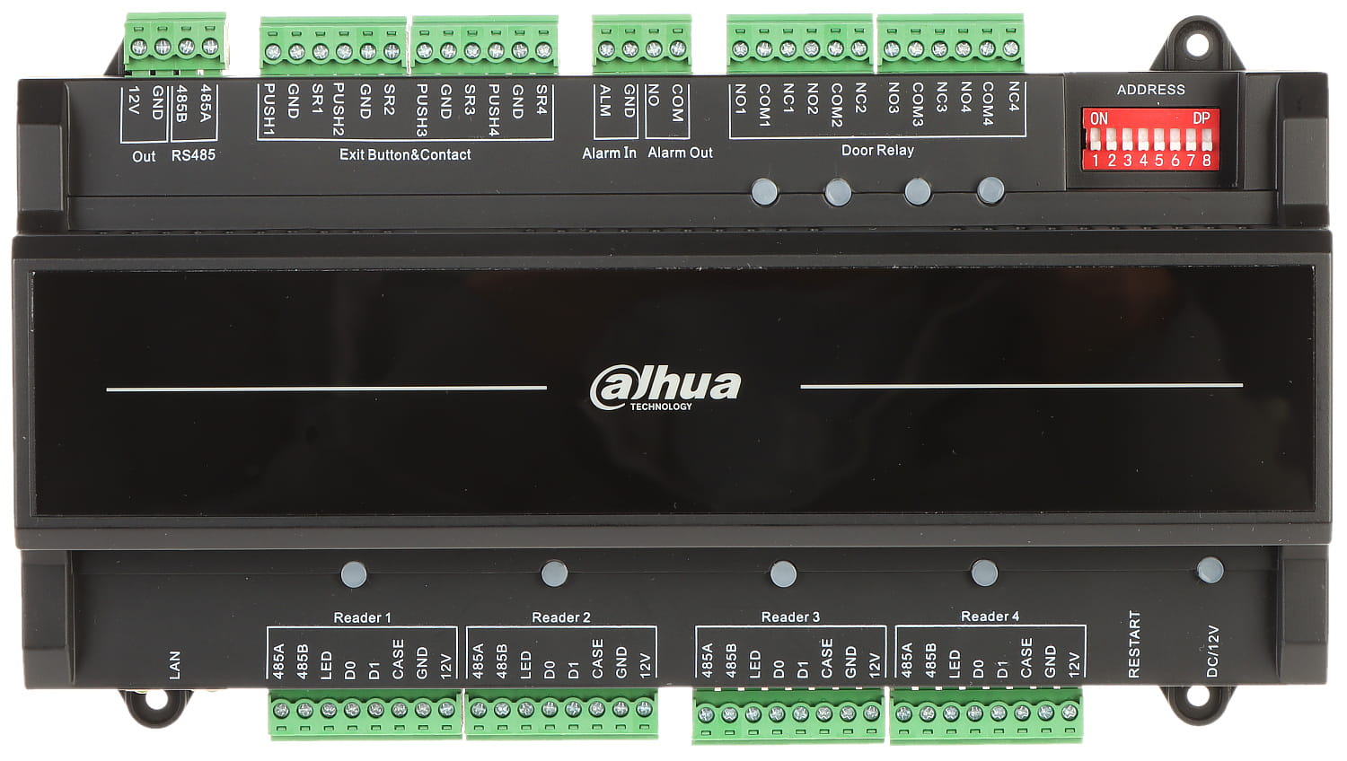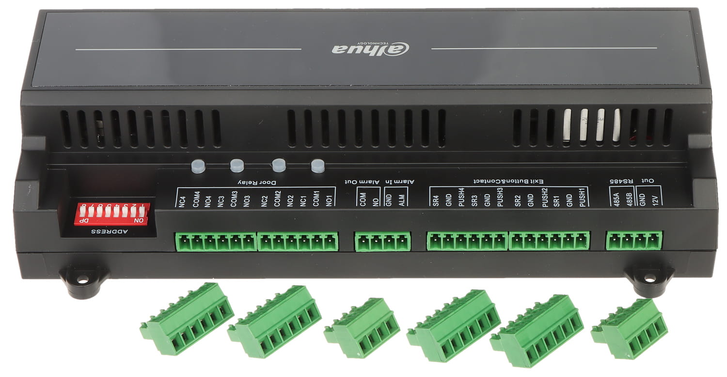 Liczba obsługiwanych przejść: 4 (jednokierunkowe) ; Liczba obsługiwanych czytników: 4 szt. ; Linie wyjściowe: 5 szt. - Przekaźnikowe ; Komunikacja: RS-485, Ethernet, Wiegand ;