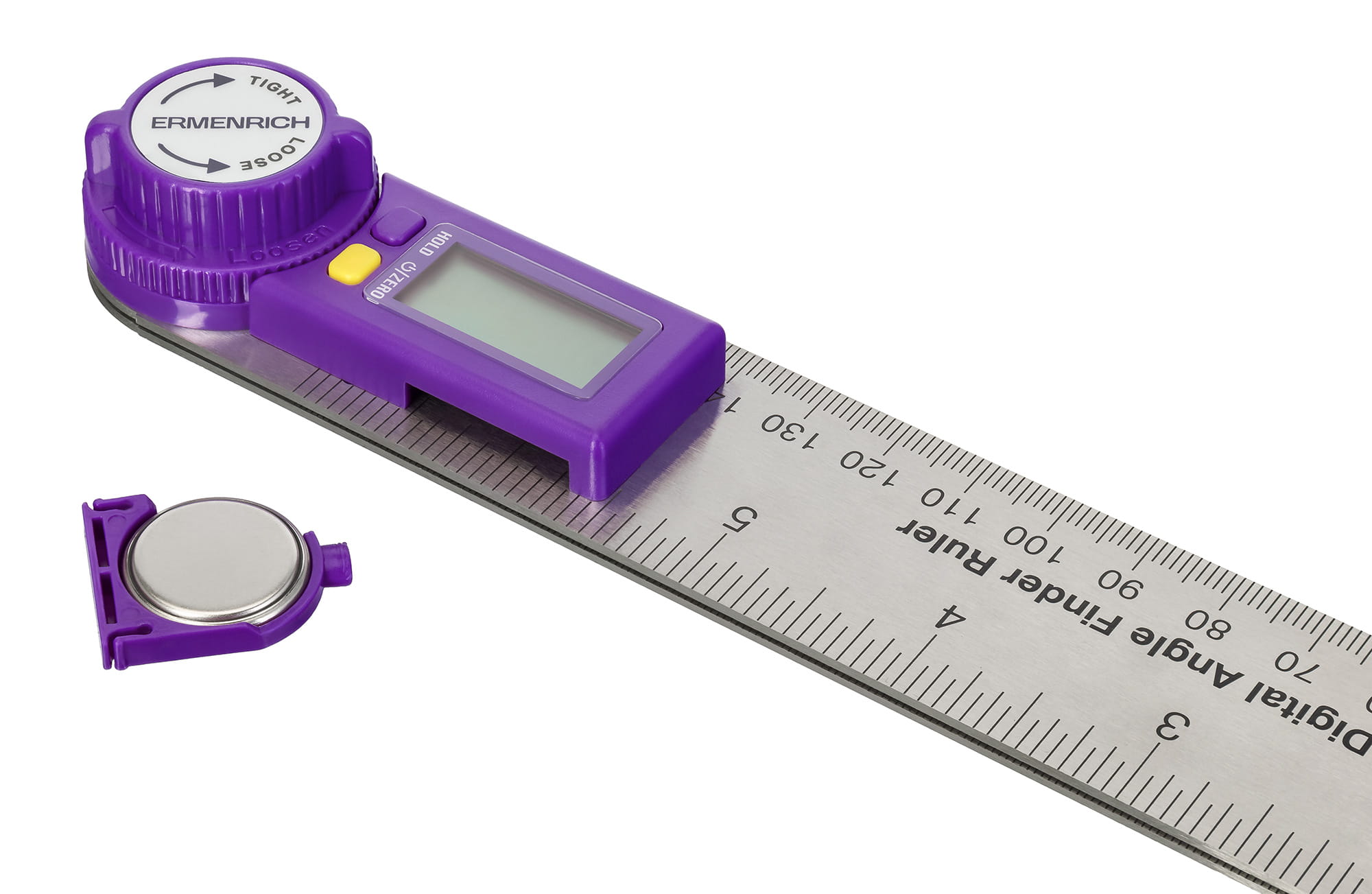 Zakres roboczy wynosi 0–360°, co pozwala precyzyjnie zmierzyć dowolny kąt. Kątomierz Ermenrich Verk DR30 jest wykonany z trwałych materiałów: stali nierdzewnej i wytrzymałego tworzywa sztucznego. W rezultacie urządzenie będzie służyć przez dłuższy czas bez konieczności jego szybkiej wymiany. Układ elektroniczny jest zasilany jedną baterią. Kątomierz z linijką wyłącza się automatycznie po 5 minutach bezczynności, co pozwala oszczędzać energię.
