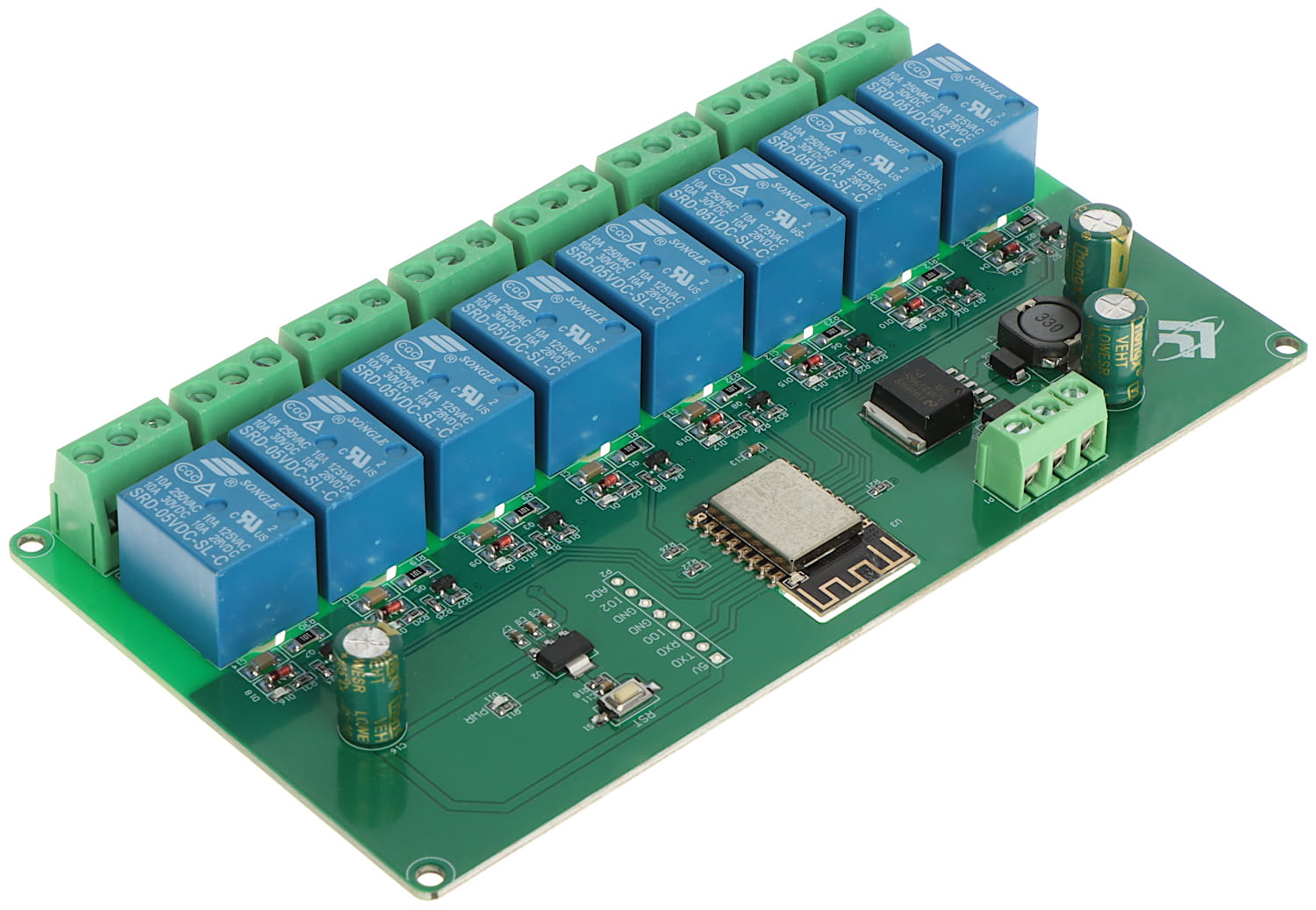 Moduł ESP12-8R-D8 pozwala na bezprzewodowe sterowanie 8 przekaźnikamiKomunikacja z urządzeniem odbywa się za pomocą interfejsu Wi-Fi