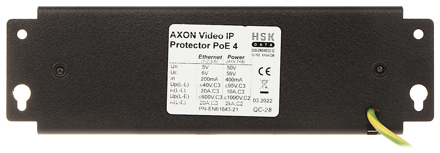 Ogranicznik w szczególności przeznaczony jest do zabezpieczenia kamer IP zasilanych zdalnie w technologii PoE, tj. poprzez niewykorzystane pary przewodów w kablu transmisyjnym; Liczba kanałów: 4 ; Poziom protekcji linia-linia: ≤ 40 V - 1 kV/µs [C3] ; Napięcie ochrony linia-uziemienie: ≤ 600 V - 1 kV/µs [C3] ; Znamionowe napięcie zasilania: 50 V ; Prąd nominalny zasilania: 400 mA ; Napięcie protekcji linia-linia dla zasilania: ≤ 95 V - 1 kV/µs [C3] ; Napięcie protekcji linia-uziemienie dla zasilania: ≤ 1000 V - 1.2/50 µs [C2] ;