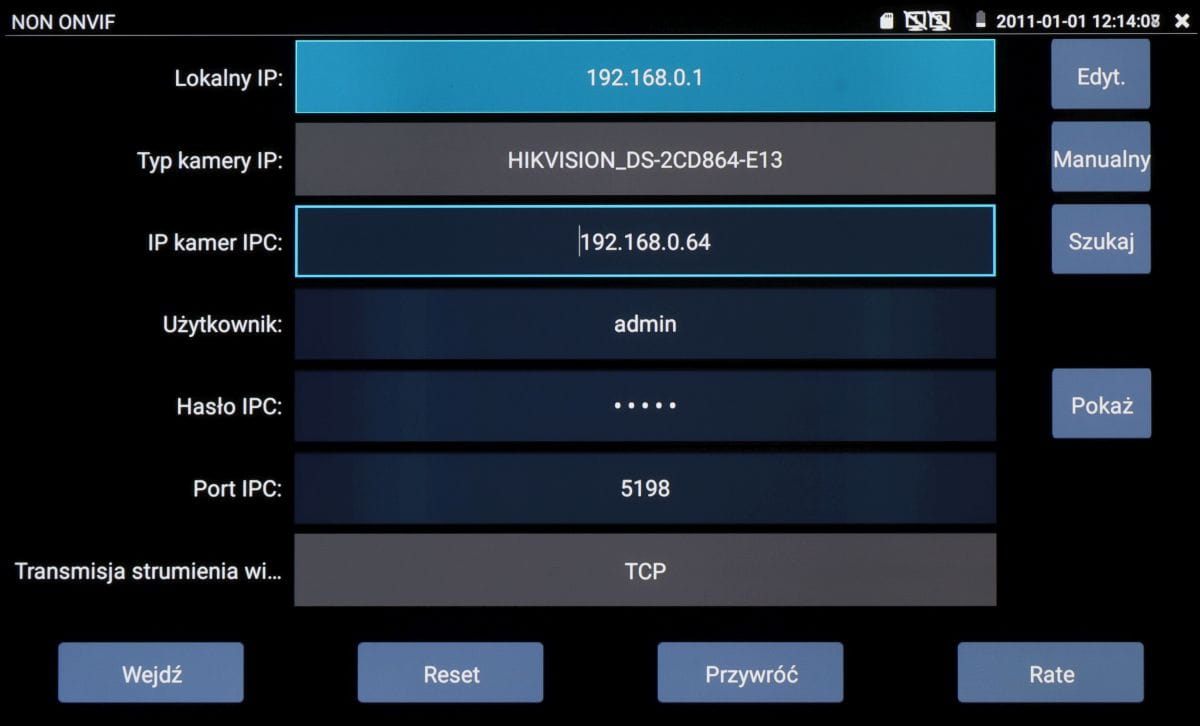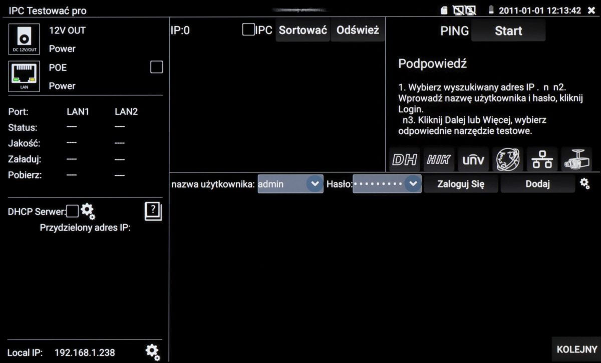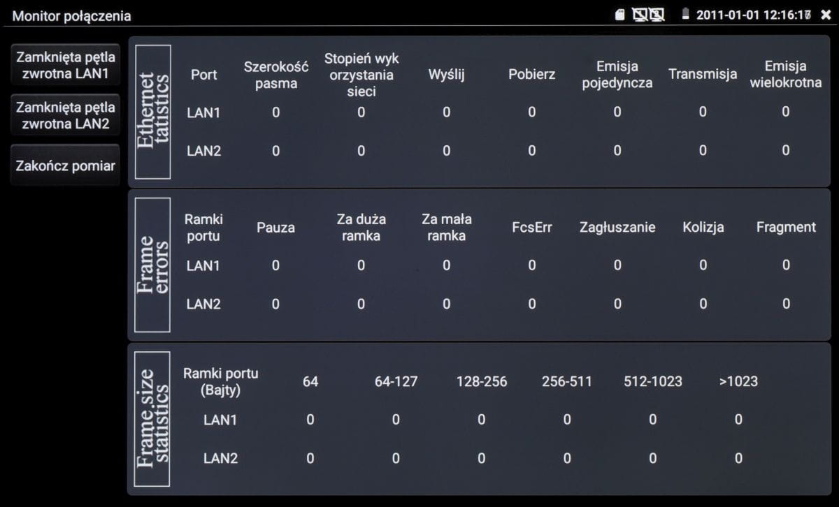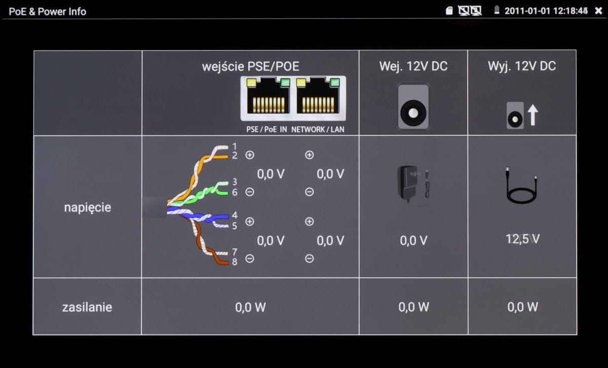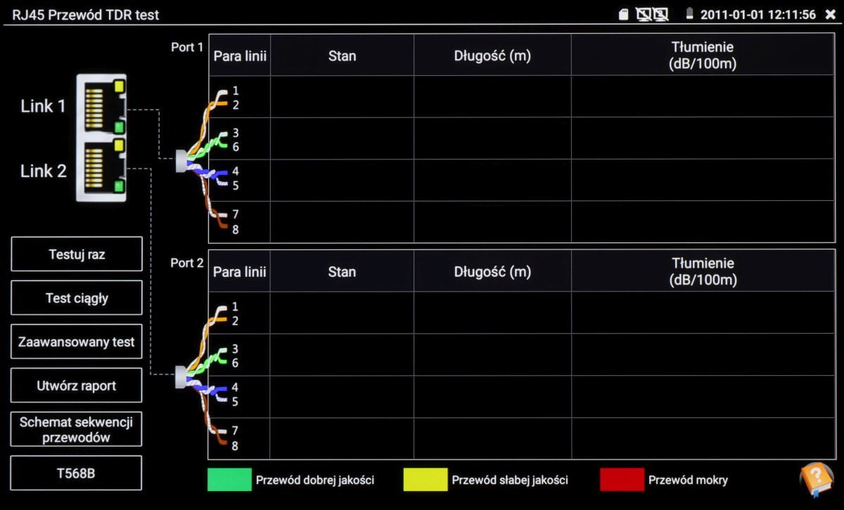 | Reflektometr TDR: | Wykrywanie i lokalizacja miejsca przerwania kabla (tylko UTP), 180 m (max) |