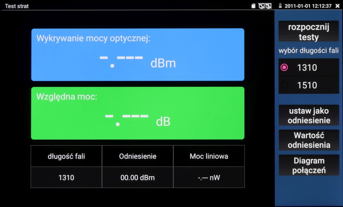 | Pomiar mocy optycznej: | Pomiar mocy optycznej w sieciach światłowodowych (adaptery ST i SC) Długość fali optycznej : 850, 1300, 1310, 1490, 1550, 1625 nm Zakres : -70 ... +10 dBm |