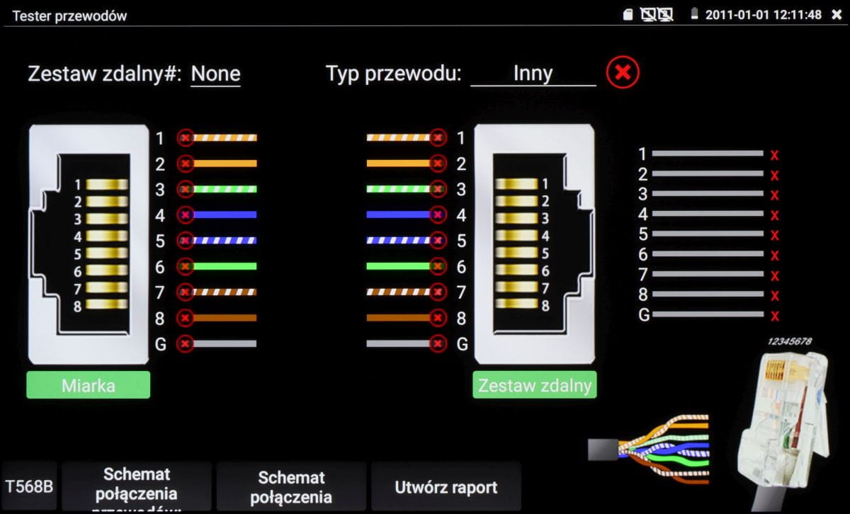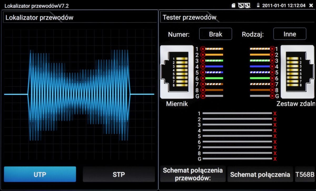 | Test skrętki lub linii telefonicznej: | Test połączenia kabli UTP lub telefonicznych, zakończonych wtykiem RJ-45 |