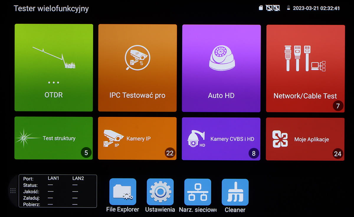 Reflektometr optyczny (OTDR): Długość fali optycznej : 1310 nm / 1550 nm, Szeroki zakres pomiarowy ≤ 105 km ; Pomiar mocy optycznej: Zakres : -70 ... +10 dBm ; VLS (VFL) - wizualny lokalizator uszkodzeń włókien światłowodowych: Laser LD ; Standard wizji: AHD, HD-CVI, HD-TVI - 8 Mpx, TCP/IP - 8K, CVBS - PAL / NTSC ; Wyświetlacz: 8 " IPS - pojemnościowy ekran dotykowy, 1920 x 1200 px ; Wejście Video: 1 szt. AHD / HD-CVI / HD-TVI / HD-SDI / CVBS - Gniazdo BNC, 1 szt. HDMI 1 szt. VGA ; Wyjście Video: 1 szt. HDMI 4K ; Port LAN: 2 szt. - Współpraca z kamerami i switchami PoE ; Porty szeregowe: RS-485 ; Moduł Wi-Fi: 2.4 GHz / 5 GHz ; Identyfikacja przewodu w wiązce; Multimetr cyfrowy: Pomiar : napięcie, prąd, rezystancja, test ciągłości, test diody, pojemność elektryczna ; Wybrane funkcje: Obsługiwane metody kompresji obrazu : H.265, H.264, MJPEG ;