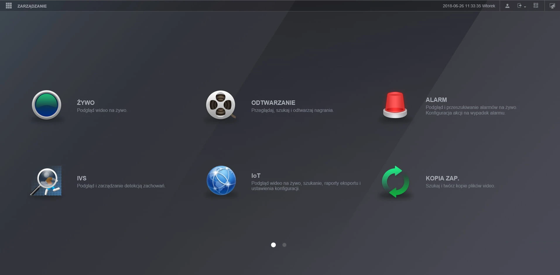 | Wyszukiwanie i odtwarzanie nagrań: | Wyszukiwanie nagrań po czasie + linia czasu z typem nagrania. Odtwarzanie: do przodu, przyspieszanie, zwalnianie, krokowo Zaawansowane wyszukiwanie (co do sekundy) Synchroniczne odtwarzanie wszystkich kanałów, funkcja Smart Search Synchroniczne odtwarzanie w podziale na 1/4/9 kanałów |