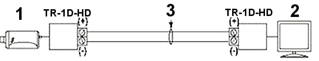 TR-1D-HD*P2 przeznaczony jest do przesyłu sygnału wideo za pomocą skrętki komputerowejUrządzenie dopasowuje impedancję kabla koncentrycznego 75 Ω do impedancji przewodu symetrycznego zapewniając przesył sygnału wizyjnego do 250m @ 720p / 150m @ 1080p (skrętka komputerowa 5e kategorii) oraz eliminuje zakłócenia niesymetryczne