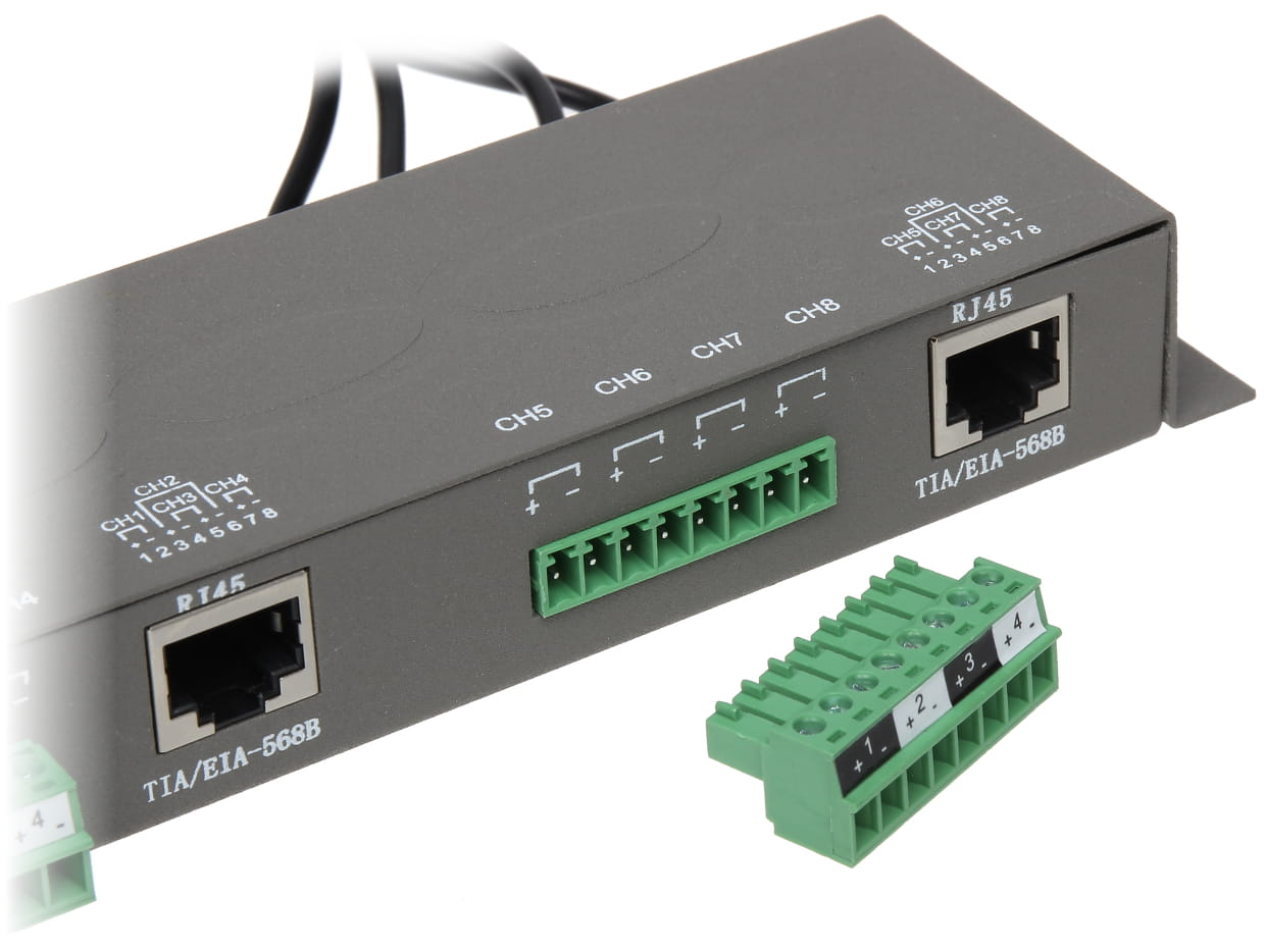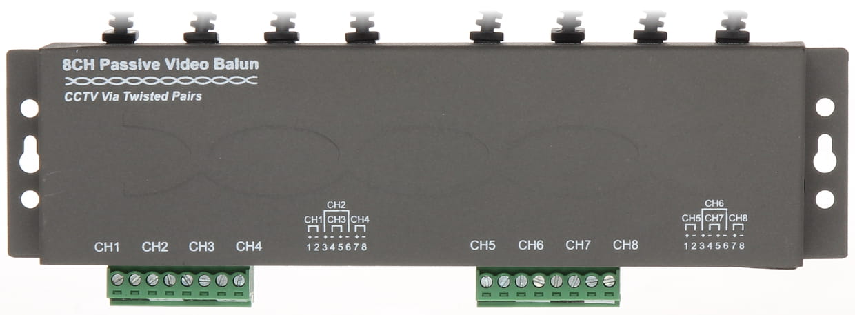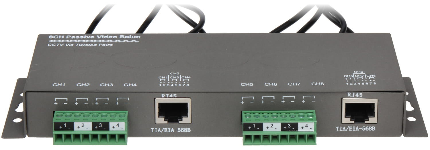 Standard: AHD - 5 Mpx, HD-CVI - 8 Mpx 4K UHD, HD-TVI - 8 Mpx 4K UHD, CVBS - PAL, NTSC ; Rodzaj urządzenia: Pasywne ; Liczba kanałów: 8 szt. Wideo ; Typ złącza symetrycznego: Zaciski kablowe / 2 x RJ-45 (8-pin, 4 pary) Gniazdo ;