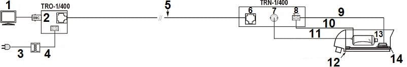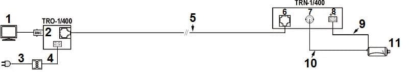 TRO-1/400 przeznaczony jest do przesyłu sygnału wizyjnego i zasilania za pomocą skrętki komputerowej (UTP, FTP)