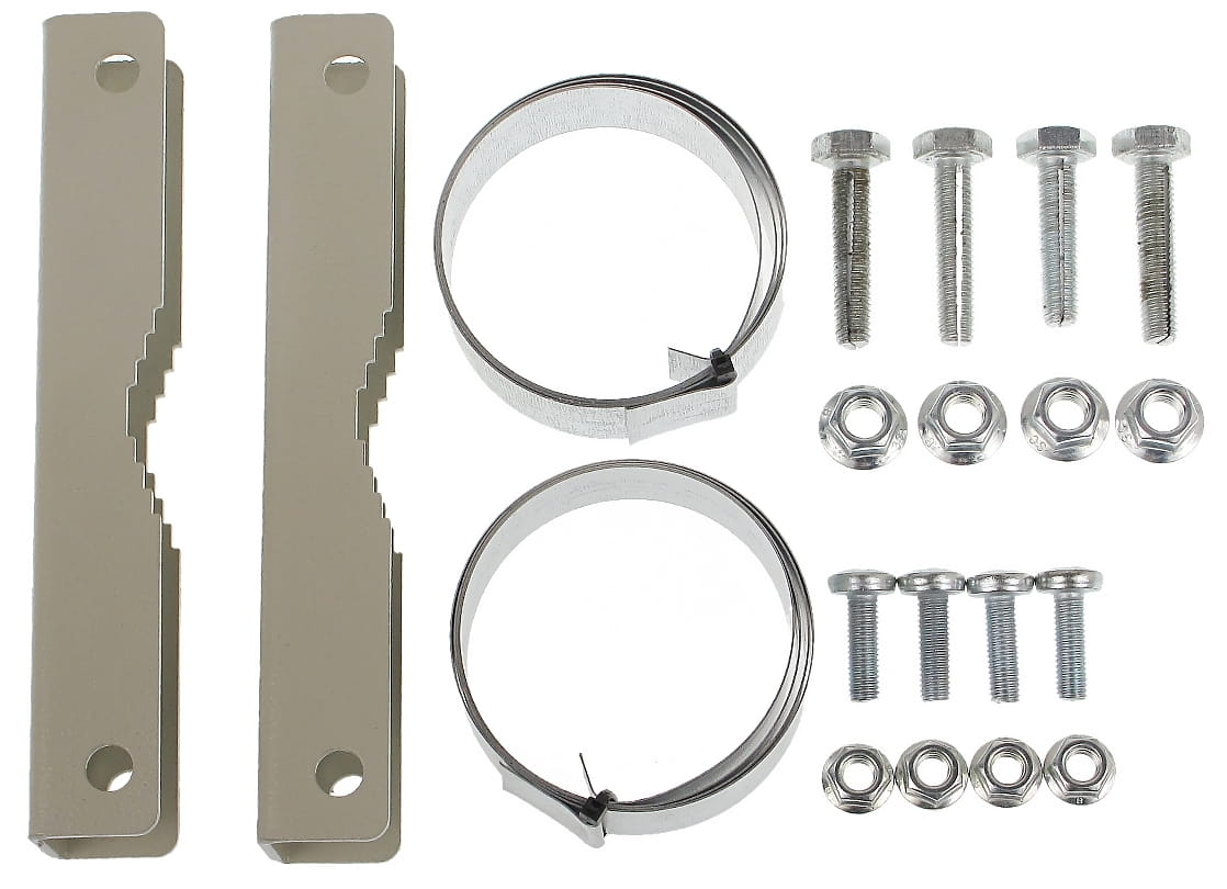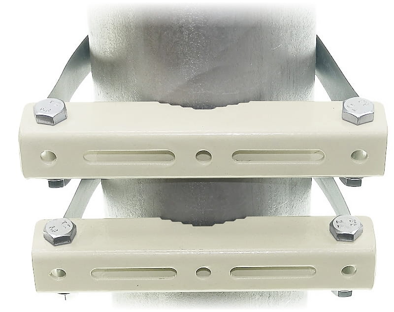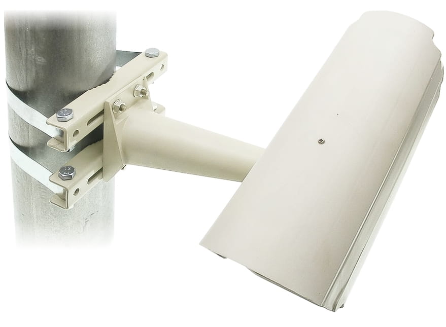 Uchwyt stalowy, malowany proszkowo, przeznaczony do zamocowania na słupach obudów kamer lub samych kamer.