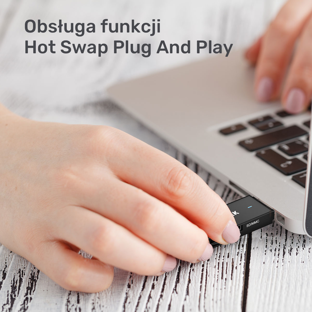 Czytnik kart pamięci Unitek ma wbudowane dwa sloty pamięci – jeden do kart standardowych a drugi do kart mikro. Obu kart można używać jednocześnie, co znacznie przyspiesza pracę. Możesz zgrywać pliki z obu kart w tym samym czasie i zapomnieć o czekaniu aż pliki zgrają się z jednej karty, aby podłączyć kolejną.