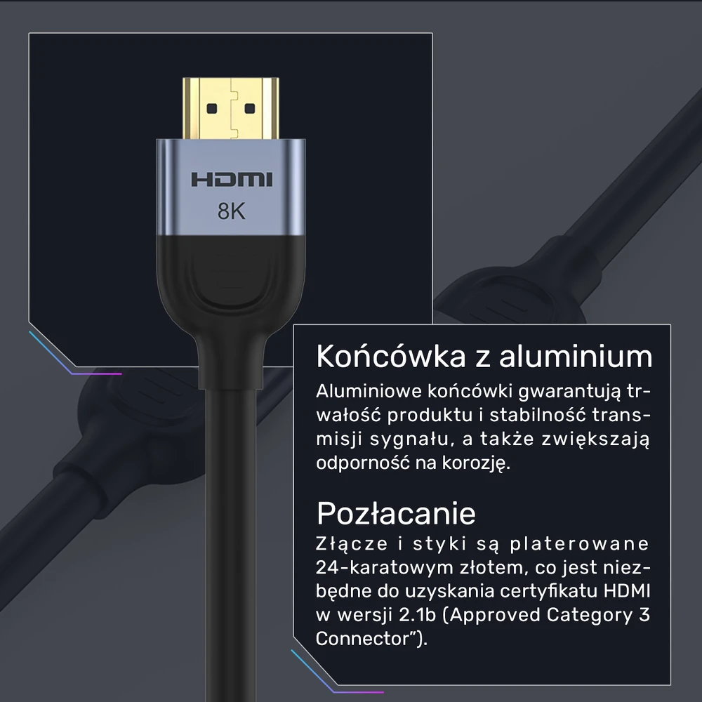 Rozdzielczość 8K – przewód może przesyłać obraz w jakości 8K@60Hz, 4k@120Hz, 2k@144Hz.