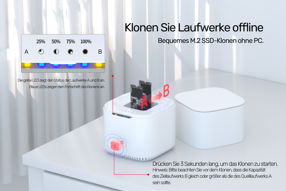 Stacja jest kompatybilna z dyskami SS2 42/60/80 mm, zarówno z kluczem M, jak i B + M. Możliwe jest stosowanie dysków o pojemności do 16 TB. Nie potrzebujesz komputera do klonowania danych między dwoma dyskami – wystarczy, ze umieścisz je w stacji. Instalacja dysków jest beznarzędziowa. Aby rozpocząć proces klonowania danych wystarczy przytrzymać frontowy przycisk minimum 3 sekundy. Postęp całego procesu widoczny jest na diodach LED. Po pół godziny bezczynności stacja przechodzi w tryb uśpienia.