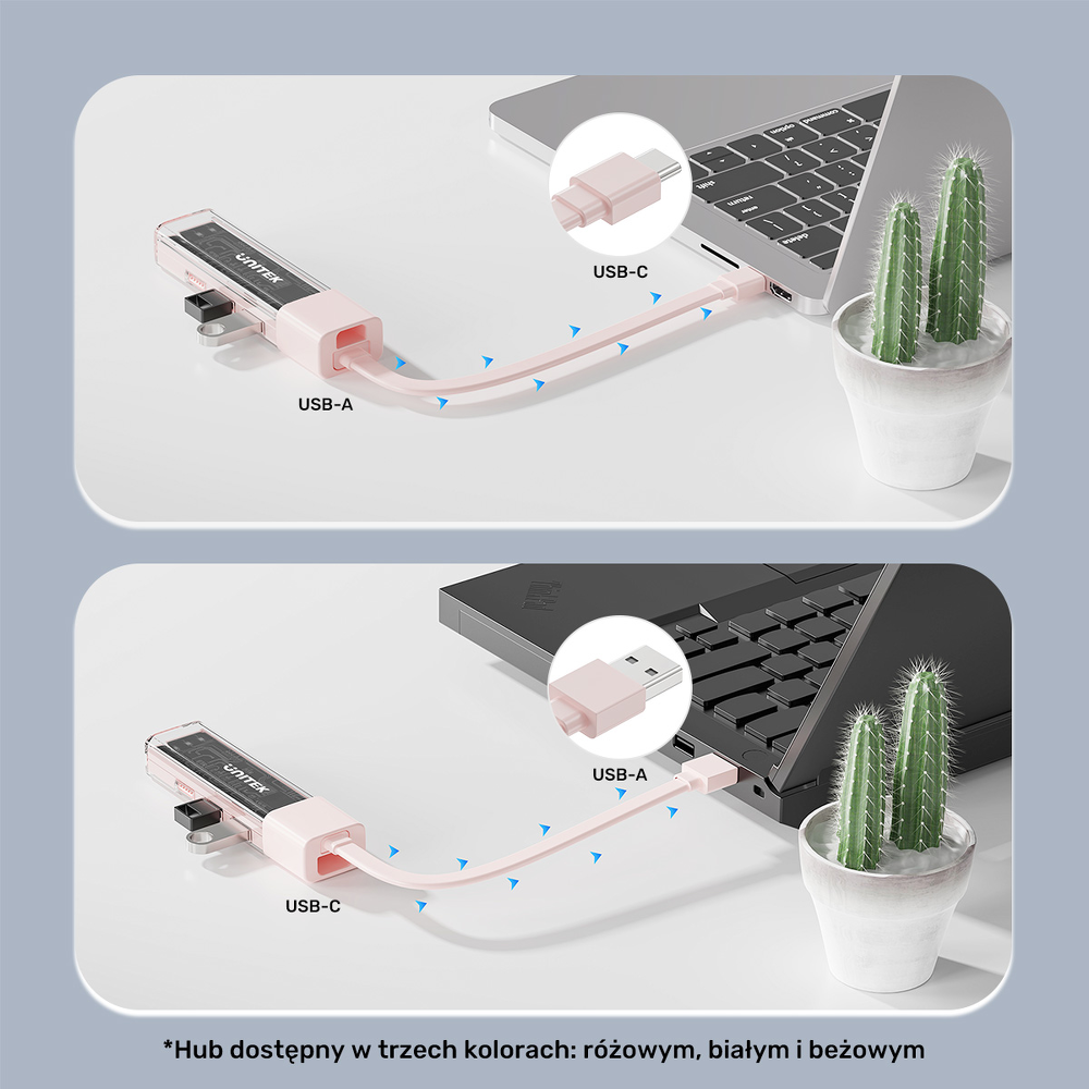 Największą zaletą Unitek H1319APK01 jest jego uniwersalne połączenie. Hub USB wyposażony jest w dwustronny kabel USB-A/USB-C, co oznacza, że możesz podłączyć go zarówno do urządzeń ze standardowym portem USB, jak i nowoczesnych laptopów czy tabletów z USB-C. Eliminuje to konieczność noszenia dodatkowych adapterów i sprawia, że hub doskonale współpracuje z każdym urządzeniem – to ogromna wygoda w codziennym użytkowaniu.