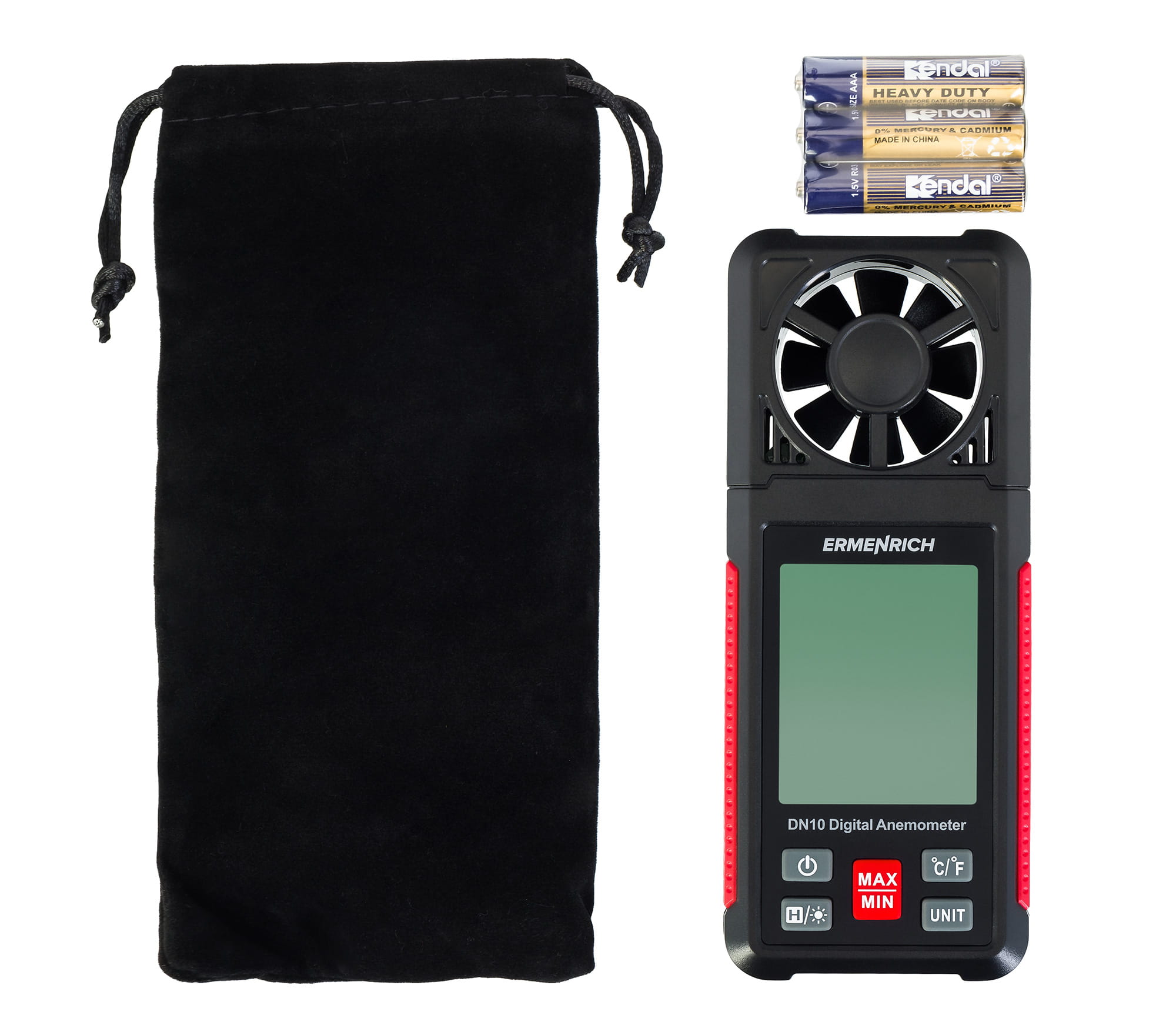 Dla wszystkich pomiarów dostępne są funkcje zatrzymywania danych i rejestrowania wartości granicznych. Dla termometru i anemometru można ustawić różne jednostki miar. Odczyty wszystkich trzech parametrów są wyświetlane na czarno-białym podświetlanym ekranie.