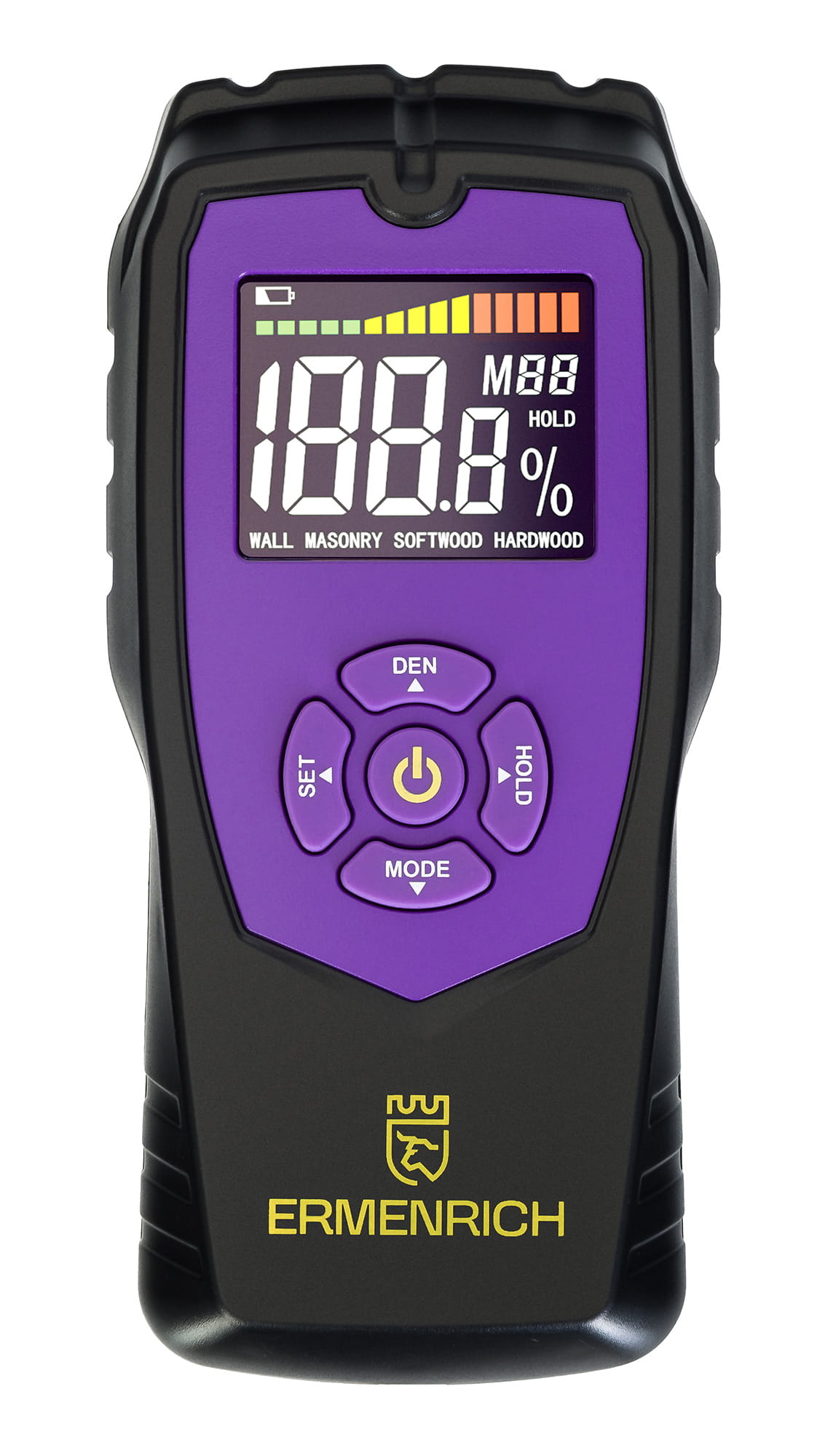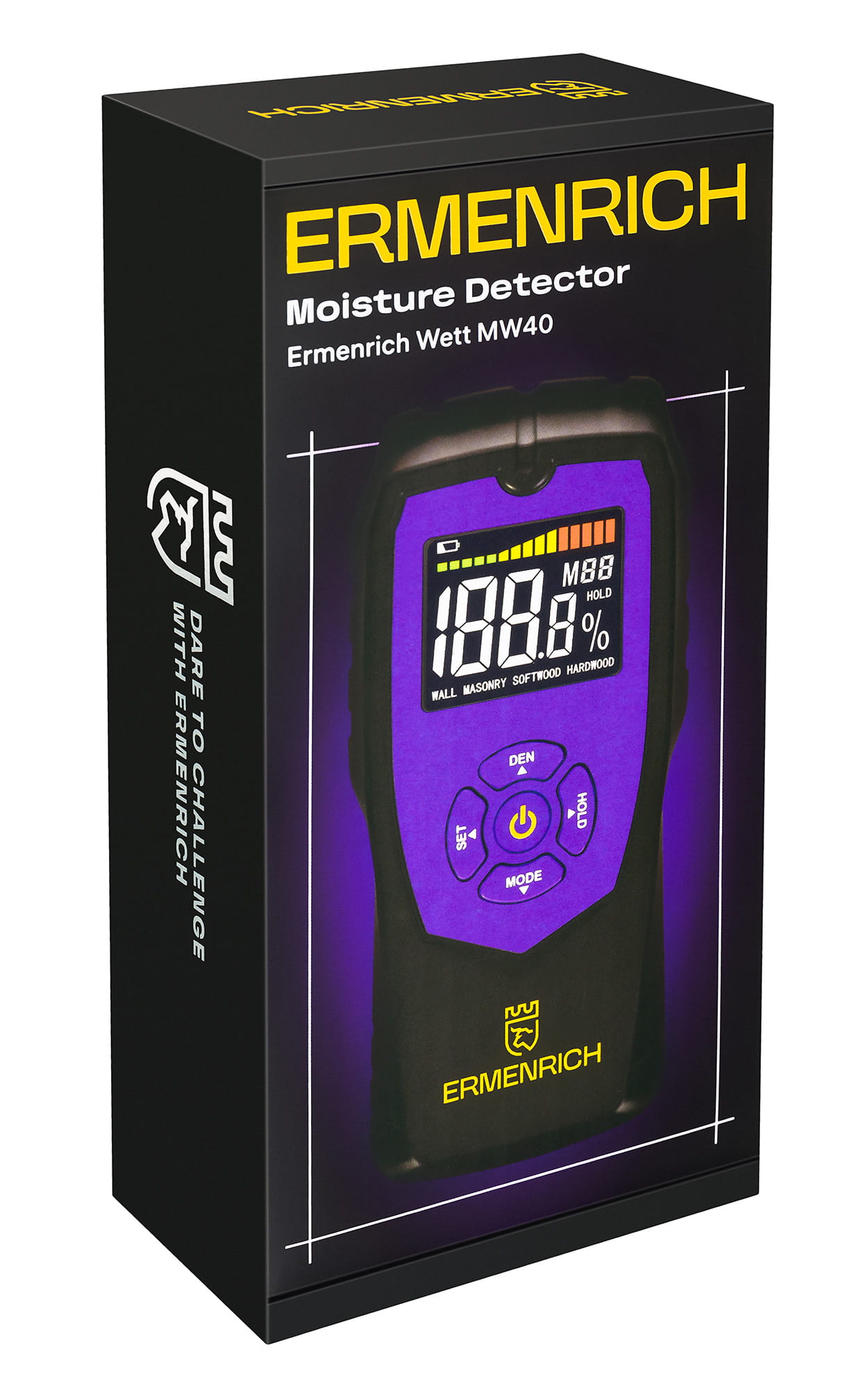 Ermenrich Wett MW40 to wilgotnościomierz bezigłowy, co oznacza, że podczas wykonywania pomiarów nie powoduje uszkodzeń powierzchni mierzonego materiału. Urządzenie może być używane do pomiarów wilgotności materiałów wykonanych z drewna, płyt gipsowo-kartonowych, betonu itp. Doskonale nadaje się do codziennego użytku, prac remontowych w mieszkaniu lub domu, a także do prac budowlanych i produkcyjnych, które wymagają wykonania pomiaru wilgotności materiałów, struktur i produktów.