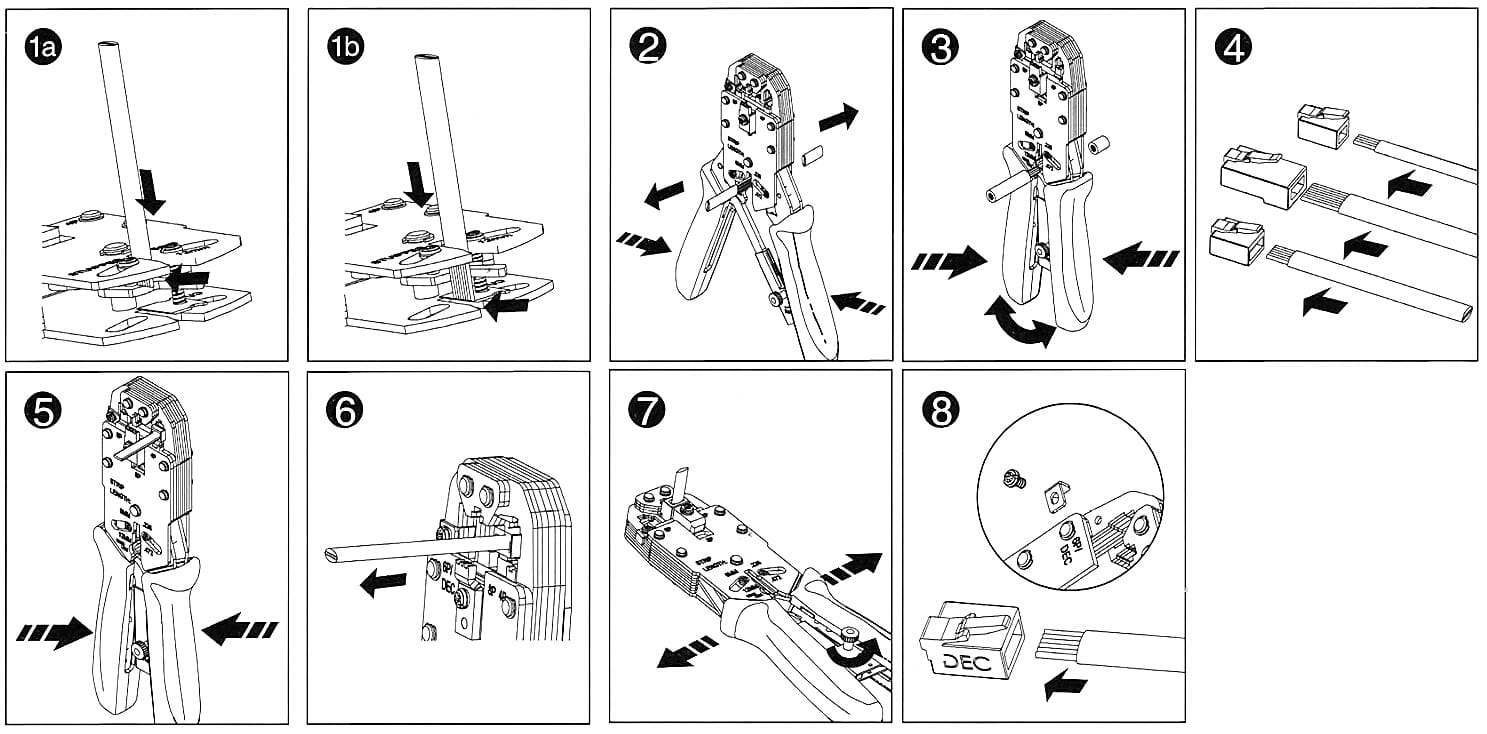 | Zastosowanie: | Wtyk RJ45 (8P8C) , Wtyk RJ12 (6P6C) , Wtyk RJ11 (6P4C) / DEC , Wtyk RJ9 (4P4C,4P2C) |