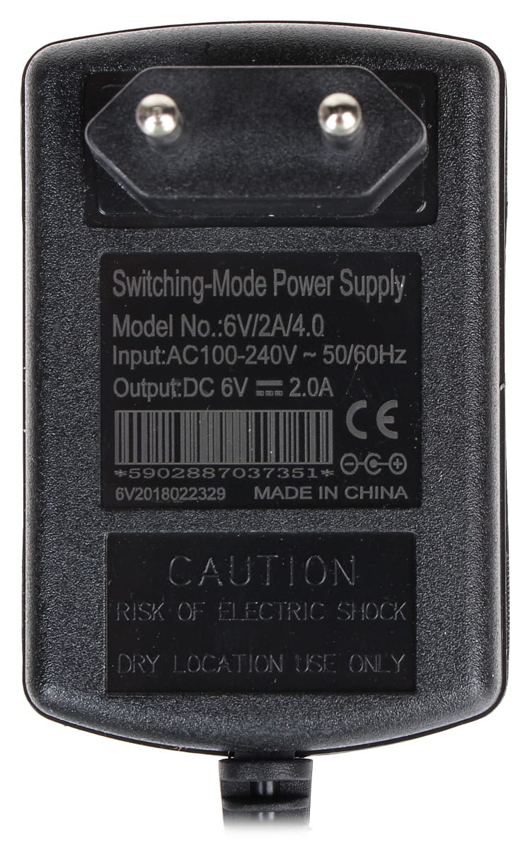 Napięcie wejściowe: 100 - 240 V AC ; Napięcie wyjściowe: 6.0 V DC ; Prąd wyjściowy: 2.0 A ; Wyjście: Wtyk 1.7 / 4.0 mm na przewodzie ;