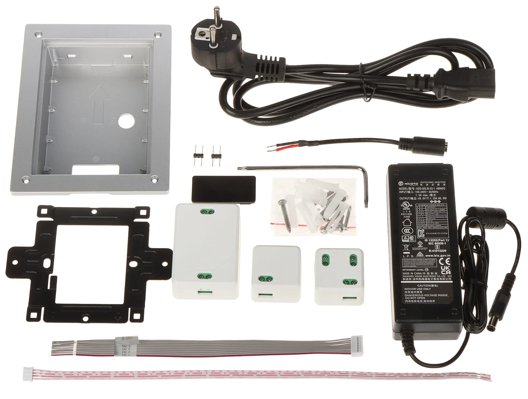 W skład zestawu wchodzą: panel wewnętrzny VTH5113H-W, wideodomofon VTO2003F, switch magistrali 2-przewodowej VTNS1003C oraz obudowa podtynkowa VTM114