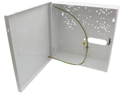 Obudowa przewiduje miejsce na akumulator ołowiowo-kwasowy 12 V 7 Ah i jest kompatybilna z wieloma centralami i modułami producentów takich jak SATEL, DSC, PARADOX, RISCO, PYRONIX czy EBS.