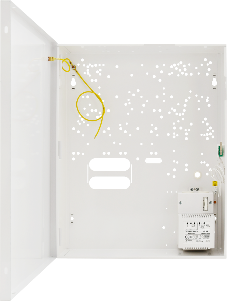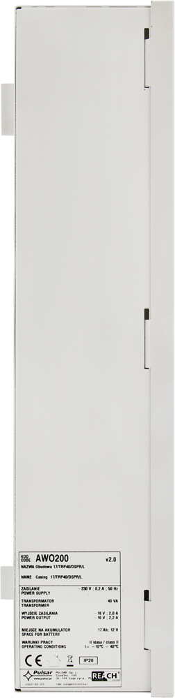 Pulsar AWO200 to uniwersalna obudowa alarmowa do montażu natynkowego, przeznaczona do instalacji central alarmowych, modułów rozszerzeń oraz urządzeń komunikacyjnych. Obudowa wyposażona jest w transformator TRP 40VA oraz przestrzeń na akumulator 12 V o pojemności 17 Ah, zapewniający podtrzymanie pracy systemu w przypadku zaniku zasilania.