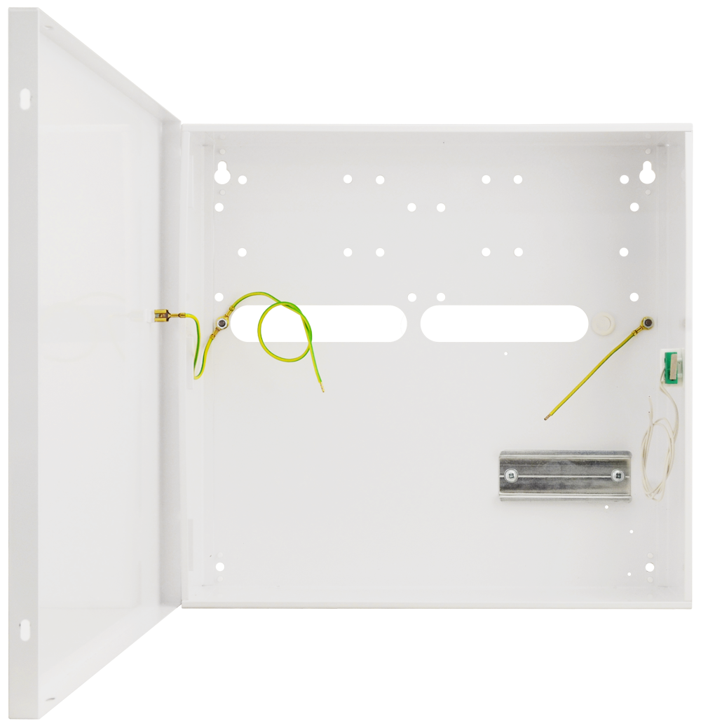 Obudowa oferuje miejsce na akumulator ołowiowo-kwasowy 12 V 17 Ah oraz jest wyposażona w szynę DIN TH35, umożliwiającą montaż zasilaczy lub innych urządzeń w standardzie DIN. Konstrukcja zapewnia porządek instalacyjny i łatwy dostęp serwisowy.