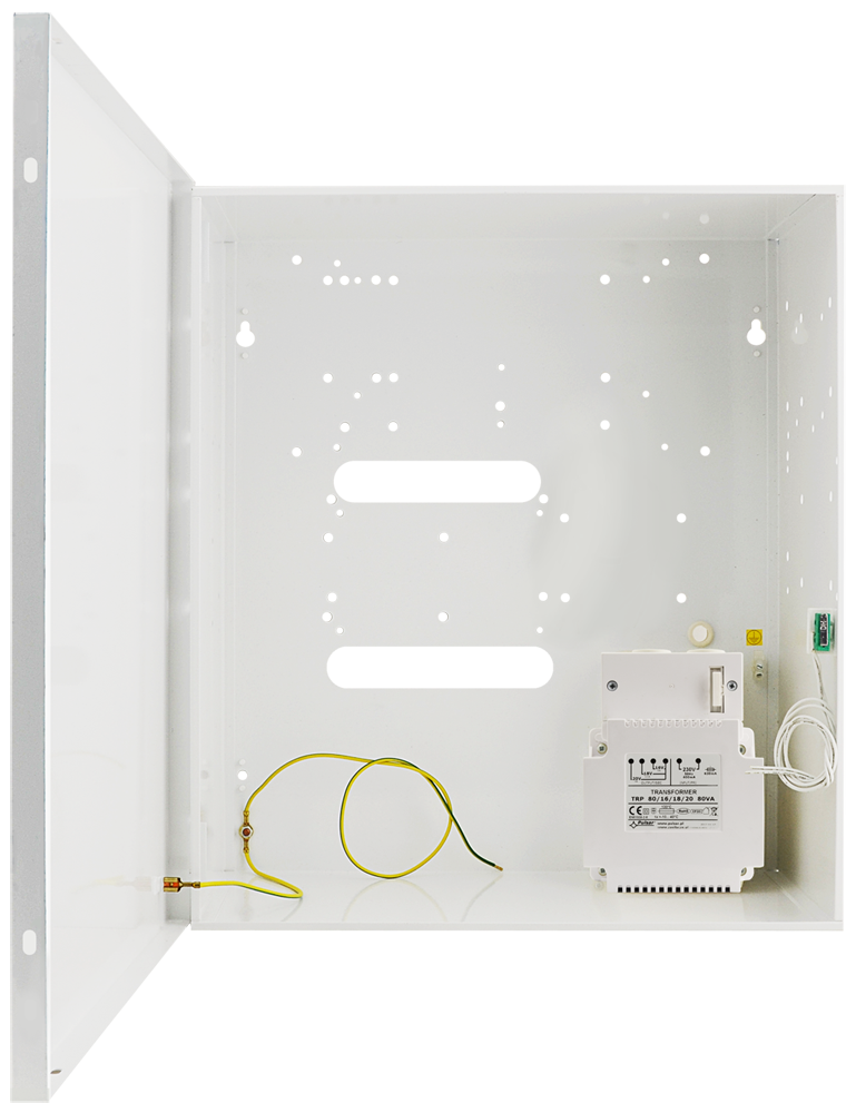 - To jest kompletna obudowa do systemu alarmowego – mieści centralę, moduły i zasilanie