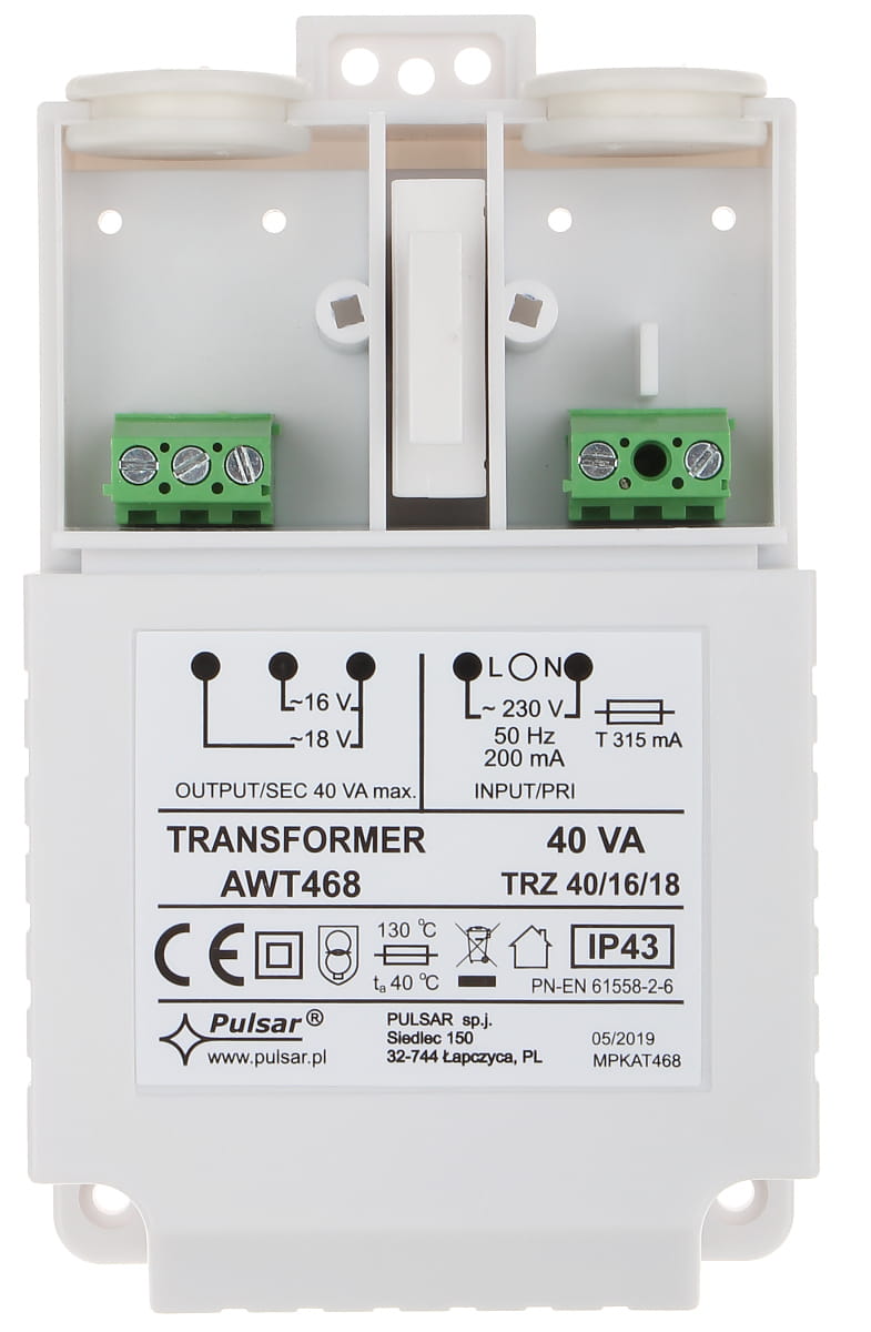 Pulsar AWT468 to transformator sieciowy przeznaczony do zasilania urządzeń wymagających napięcia przemiennego AC 16 V lub 18 V. Jest stosowany głównie w systemach alarmowych, kontroli dostępu oraz innych instalacjach niskonapięciowych, gdzie wymagane jest stabilne i bezpieczne źródło zasilania.