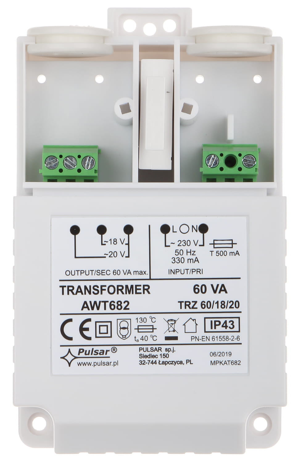 Pulsar AWT682 to transformator sieciowy przeznaczony do zasilania urządzeń wymagających napięcia przemiennego AC 18 V lub 20 V. Stosowany jest w systemach alarmowych, kontroli dostępu oraz innych instalacjach niskonapięciowych, gdzie wymagane jest stabilne źródło zasilania o podwyższonej mocy.